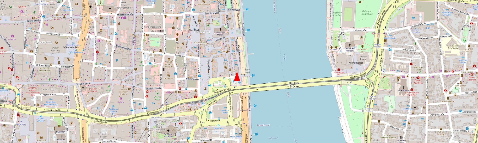 Der Eingang zur Frankenwerft 1 befindet sich 400 m vom Heumarkt entfernt, Eingang vom Rheinufer aus; Höhe Pegel Köln.